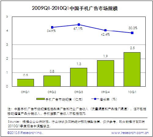 2010Q1中國手機(jī)廣告市場規(guī)模達(dá)到2.5億,環(huán)比增長30.3%.受季節(jié)性因素影響,手機(jī)廣告市場增速放緩,但是保持增長發(fā)展態(tài)勢。本季度,新聞、體育、數(shù)碼、女性和汽車類手機(jī)廣告市場表現(xiàn)良好,文本、橫幅、全屏以及客戶端軟件等手機(jī)廣告形式受到廣告主青睞。針對不同受眾群體進(jìn)行多重定向廣告營銷成為更多手機(jī)廣告服務(wù)提供商的實(shí)踐方向。盡管本季度手機(jī)廣告市場取得良好的市場表現(xiàn)力,但是廣告定價(jià)和廣告效果評估等制約手機(jī)廣告市場發(fā)展的關(guān)鍵因素仍將長期存在。