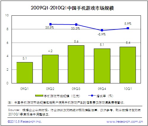 2010Q1中國手機(jī)游戲市場規(guī)模為5.4億,環(huán)比增長5.9%.2009年底電信運(yùn)營商調(diào)整業(yè)務(wù)合作伙伴計(jì)費(fèi)政策,導(dǎo)致WAP和G+手機(jī)游戲平臺(tái)等特定計(jì)費(fèi)平臺(tái)暫時(shí)停止計(jì)費(fèi),對手機(jī)游戲市場營收增長產(chǎn)生不利影響。除了季節(jié)因素以外,手機(jī)單機(jī)游戲受電信運(yùn)營商暫停WAP計(jì)費(fèi)影響較大,手機(jī)網(wǎng)游受政策影響有限。盡管本季度手機(jī)游戲市場扭轉(zhuǎn)營收規(guī)模下滑的不利局面,重新恢復(fù)增長態(tài)勢,但是手機(jī)游戲?qū)﹄娦胚\(yùn)營商計(jì)費(fèi)通道的高依存度,決定行業(yè)受政策風(fēng)險(xiǎn)的影響較大。實(shí)現(xiàn)營收多元化是手機(jī)游戲業(yè)界思考和關(guān)注的問題。