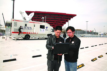 中國(guó)電信的應(yīng)急衛(wèi)星通信車抵達(dá)中國(guó)館,為世博會(huì)開幕護(hù)航。
