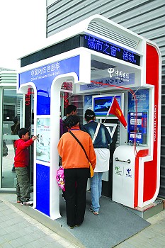 游客來到世博園區(qū)內(nèi)的電信營(yíng)業(yè)廳體驗(yàn)綜合信息服務(wù)。