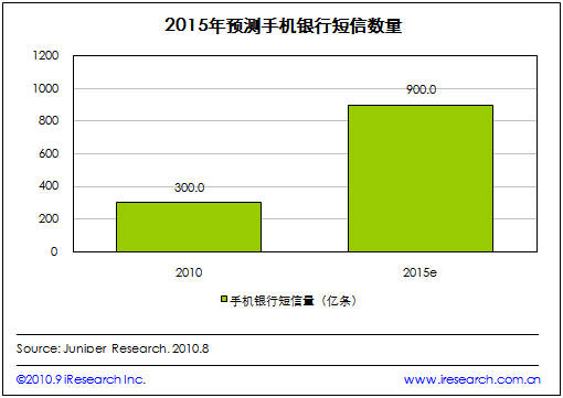 艾瑞咨詢根據(jù)Juniper Research發(fā)布的預(yù)測數(shù)據(jù)發(fā)現(xiàn),由于新類型的手機(jī)銀行短信提醒的應(yīng)用,到2015年,全球手機(jī)銀行短信量將達(dá)到900億條每年,相當(dāng)于每個(gè)手機(jī)銀行用戶每隔一天就會收到一條銀行發(fā)來的信息。