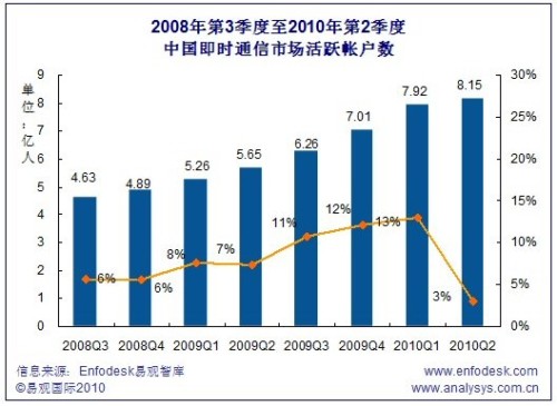 2010Q2中國即時(shí)通信市場活躍帳戶數(shù)超過8億