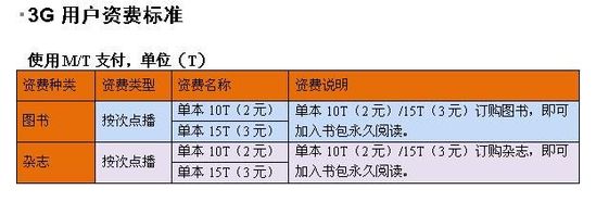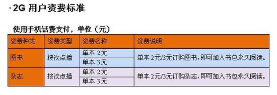 據(jù)了解,中國聯(lián)通手機閱讀業(yè)務(wù)只針對聯(lián)通網(wǎng)內(nèi)手機用戶,采用按次點播(按本訂購)的資費標(biāo)準。同時,2G用戶和3G用戶采用不同的支付方式,2G用戶使用手機話費支付,3G用戶使用M/T支付。