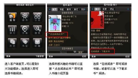 據(jù)了解,中國聯(lián)通手機閱讀業(yè)務(wù)分為三個專區(qū)。目前,圖書頻道包括16類24000余本圖書,雜志頻道包括17類500余本雜志。此外,用戶可選擇進入聽書頻道,下載并收聽圖書。