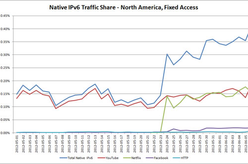 根據網絡設備公司Sandvine公布的數據,在昨天的“IPv6全球啟動日”上,IPv6數據流量在美國創(chuàng)下了歷史新高。IPv6流量最近一次出現爆發(fā)式增長要追溯到兩周前在線視頻播放網站Netflix宣布支持IPv6協(xié)議的日子。此后的幾天內,Facebook等頂級互聯網公司均陸續(xù)開放IPv6協(xié)議支持。