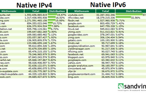 根據Sandvine的采樣數據,YouTube服務貢獻了最多的IPv6流量,約為57%。緊接著是Netflix,流量貢獻約為32%。Facebook及其內容分發(fā)網絡分別貢獻了1.15%和2.7%的流量,谷歌主頁則貢獻了1.42%的流量。(盧鑫)
