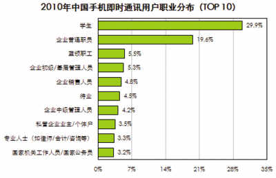一系列研究數(shù)據(jù)足以說(shuō)明些問(wèn)題。研究公司艾瑞咨詢(xún)報(bào)告數(shù)據(jù)顯示,2010年中國(guó)手機(jī)上網(wǎng)用戶(hù)達(dá)到3.03億,在總網(wǎng)民數(shù)中占比約為66.3%。這其中,57.4%的用戶(hù)使用即時(shí)通訊服務(wù),位列手機(jī)上網(wǎng)用戶(hù)十大行為的第二位。