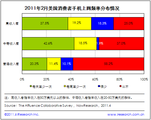 2011年:美國中高端收入人群手機(jī)上網(wǎng)頻率較高