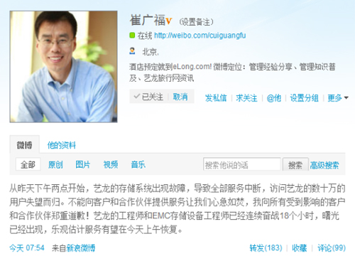 7月12日上午消息,因遭遇存儲故障,從昨日下午2時(shí)起,提供在線服務(wù)的旅游網(wǎng)站藝龍開始無法訪問,截至目前已經(jīng)過去了20個(gè)小時(shí)。藝龍CEO崔廣福通過新浪微博表示,藝龍工程師和EMC存儲工程師正在緊張搶修中,預(yù)計(jì)今天上午能夠恢復(fù)正常。新浪科技