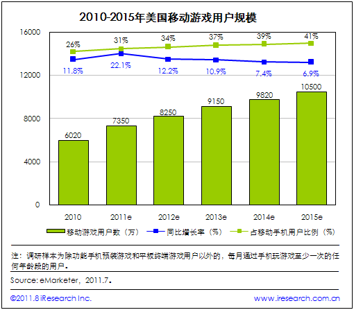iResearch艾瑞咨詢根據eMarketer最新發(fā)布數據發(fā)現,2010年美國移動游戲用戶規(guī)模為6020萬人,同比增長11.8%,占美國移動手機用戶比例為26%;預計未來五年內,用戶規(guī)模將保持持續(xù)增長勢態(tài),2011年將出現一個較高的增長點,移動游戲用戶數將達到7350萬人,同比增長22.1%,在移動手機用戶中的滲透率達31%;之后增長將逐漸趨緩,到2015年用戶規(guī)模將突破一億,達到1.05億,同比增長率降為6.9%,滲透率達41%。
