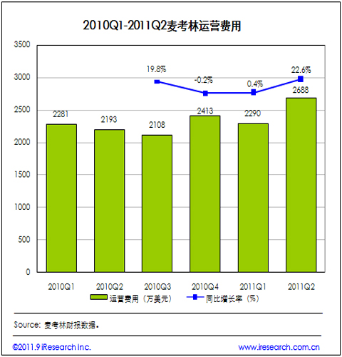 2011Q2麥考林運營費用為2688萬美元,同比增加22.6%。據(jù)麥考林CFO披露,2011Q2市場營銷費用收入的比例為14%,即822萬美元(2011Q1市場營銷費用收入比例為13%,即625萬美元,且60%用于線上渠道,40%用于呼叫中心渠道),行政與管理費用達(dá)到1774萬美元的水平。