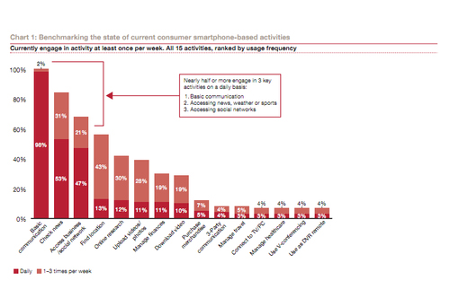 將近一半或一半以上的用戶每天都使用三大功能:基本的通信功能;獲取新聞天氣體育等信息,以及使用社交網(wǎng)絡(luò)