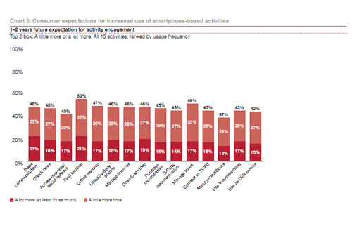 而在未來兩年,這些不同的功能使用只會(huì)越來越多,像基本的通信功能、LBS等,21%的用戶預(yù)計(jì)使用的程度將是今天的2倍以上