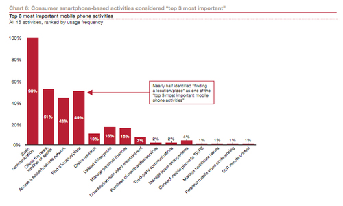 在用戶認(rèn)為最重要的移動(dòng)活動(dòng)中,尋找本地位置位于基本通信功能、新聞閱讀之后,而且超過56%的用戶每周至少會(huì)使用手機(jī)一次查找位置信息