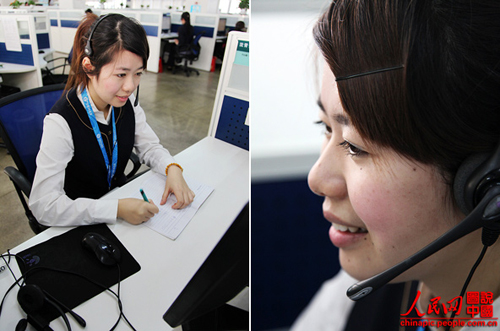 沈青青,今年24歲,湖州人,擔(dān)任浙江移動(dòng)10086接線員已經(jīng)兩年了,是2011年下半年度杭州濱江中心的服務(wù)明星。她每天要接聽(tīng)至少200-300個(gè)電話,每次她總能以甜美的聲音為顧客解決一個(gè)又一個(gè)的問(wèn)題。