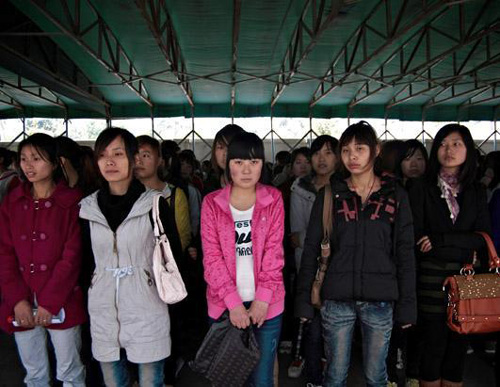 在一個(gè)周一上午,約3000名外來(lái)工人在深圳的富士康招聘中心門前,希望獲得在富士康的工作機(jī)會(huì)。