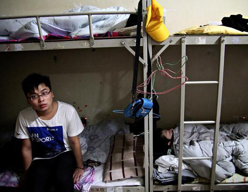 富士康一名員工從睡夢(mèng)中醒來(lái),而他的兩名同事仍在繼續(xù)睡覺。在富士康宿舍中,8名工人共用一個(gè)單間。