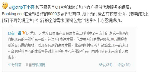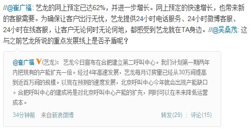崔廣福在微博上說:“藝龍的網(wǎng)上預(yù)定已達62%,并進一步增長。網(wǎng)上預(yù)定的快速增長,也帶來新的客服需要。為確保讓客戶出行無憂,藝龍?zhí)峁?4小時電話服務(wù)、24小時微博客服、24小時在線客服,讓客戶無論何時無論何地,都感受到藝龍就在TA身邊!