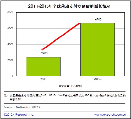 iResearch艾瑞咨詢整理Netbanker的最新數(shù)據(jù)發(fā)現(xiàn),2011年全球移動支付交易量達(dá)到2400億美元。該統(tǒng)計數(shù)據(jù)顯示,2015年全球移動支付交易量將達(dá)到6700億美元,使用手機銀行應(yīng)用程序的用戶數(shù)量較2010年將增加45%左右。另外,預(yù)計在未來18個月內(nèi)還會有20個國家增設(shè)NFC服務(wù)。