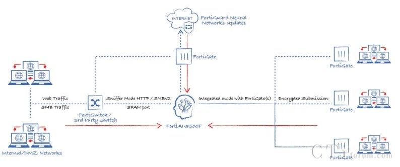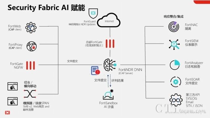 此外,AI技術(shù)還貫穿于Fortinet的多個產(chǎn)品與功能中,形成高效的工作流。以威脅檢測與響應(yīng)為例,當(dāng)FortiGate的雙引擎也無法確定某個文件的合法性時,它可以將該文件提交給FortiNDR進(jìn)行深度分析,利用云端深度神經(jīng)網(wǎng)絡(luò)AI進(jìn)行0 Day攻擊、勒索軟件等深層次分析。若仍無法確定,還可進(jìn)一步提交給FortiSandbox,在虛擬機環(huán)境中進(jìn)行模擬操作,進(jìn)行更為深入的檢測。在這一系列流程與技術(shù)的支持下,F(xiàn)ortinet的威脅檢測與響應(yīng)能力已達(dá)到業(yè)界頂尖水平,向滿分100分邁進(jìn)。