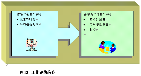 。。和對(duì)CSR工作的評(píng)估一樣,ProSci 1999表追研究也指出了當(dāng)前對(duì)呼叫中心管理層的工作評(píng)估趨勢(shì)。這包括:?jiǎn)T工生產(chǎn)力、員工激勵(lì)以及客戶滿意度。