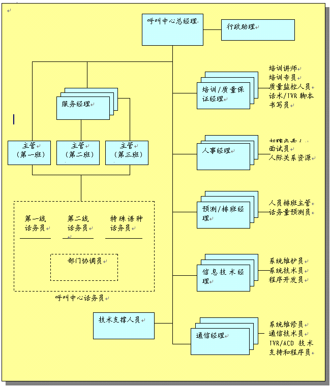 呼叫中心組織結構概述了中心的任務和職責。對組織進行了統籌安排以便中心能有效達到工作目標,組織安排主要有:
