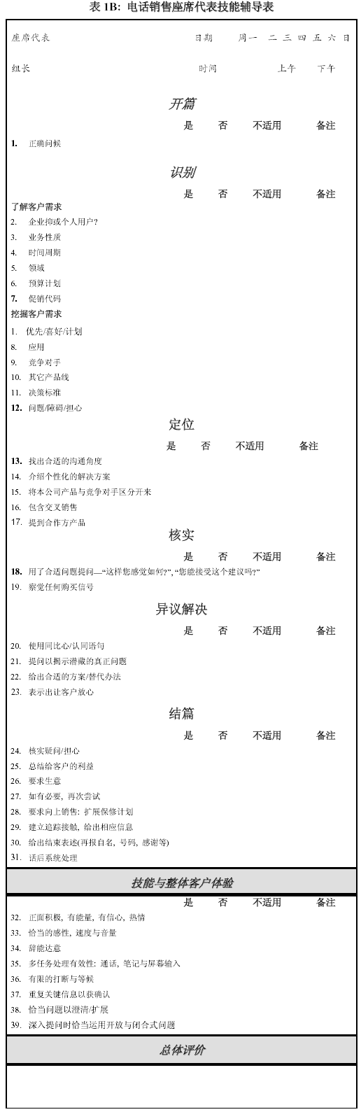 。。以上的表格主要是給從事客戶服務(wù)的座席代表使用,以下的表格是根據(jù)我自己使用過(guò)的對(duì)具電話營(yíng)銷功能的座席代表輔導(dǎo)表改動(dòng)而來(lái)。