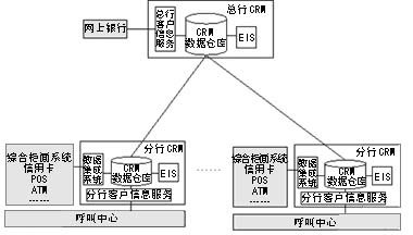 由于銀行在各地建有大量的分支機(jī)構(gòu),銀行CRM系統(tǒng)一般都采用分布式數(shù)據(jù)倉庫環(huán)境,即所有分行均擁有自己的CRM系統(tǒng),并與本地綜合業(yè)務(wù)系統(tǒng)及呼叫中心連接。在總行建有中心CRM數(shù)據(jù)倉庫,提供面向全行的分析決策功能,并為網(wǎng)上銀行業(yè)務(wù)提供數(shù)據(jù)查詢支持。
