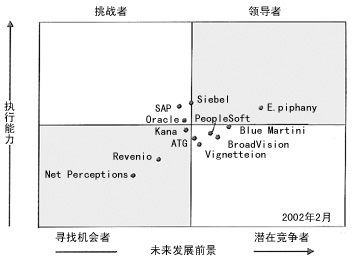 E.piphany依靠其分析能力和個性化方面的優(yōu)勢,仍然是該市場的領導者。但是其領先地位開始受到了強有力的挑戰(zhàn)。其中,Siebel對其領先地位構成很大的威脅,正在逐步邁入該市場的領導者行列。Blue Martini Software由于受到其零售和生產能力方面的限制,目前依然稍稍遜色于E.piphany。