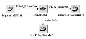 客戶信息數(shù)據(jù)庫中的各表以客戶編碼為關(guān)鍵字進(jìn)行關(guān)聯(lián),客戶編碼是由客戶的證件號碼經(jīng)過專門的算法計(jì)算產(chǎn)生的唯一客戶標(biāo)識。根據(jù)各個系統(tǒng)中客戶數(shù)據(jù)與新系統(tǒng)客戶信息的對照關(guān)系我們設(shè)計(jì)數(shù)據(jù)抽取轉(zhuǎn)換的程序,如圖4所示是一個DataStage的Job。
