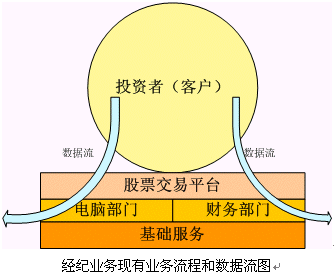 。。從上圖可以看出,現(xiàn)在的證券公司的經(jīng)紀(jì)業(yè)務(wù)為各個(gè)股民或者說投資者所提供的服務(wù)就是交易平臺的服務(wù),也就是交易通道服務(wù)。營業(yè)部的其他服務(wù)都是為這個(gè)交易通道服務(wù),這些服務(wù)品種都是非;A(chǔ)的。而營業(yè)部的數(shù)據(jù)流,也就是各個(gè)客戶的基本信息和交易信息,通過電腦部和財(cái)務(wù)部門就走到了終結(jié),沒有被更好的利用。