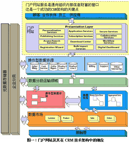 圖一向我們展示了一種CRM技術(shù)架構(gòu),它以Web門(mén)戶(hù)網(wǎng)站作為客戶(hù)、合作伙伴、員工和供應(yīng)商之間的通路,并以此作為它的主要特征。