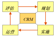 如圖所示,CRM的實施步驟是診斷-規(guī)劃-實施-評估的閉環(huán)的過程,保證了"大處著眼、小處入手、迅速見效"。這樣保證了既有長遠(yuǎn)的規(guī)劃和目標(biāo),又能夠步步為營,鞏固實施成果。