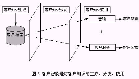 客戶知識是人們通過實踐認(rèn)識到的、與客戶有關(guān)的規(guī)律性,而客戶智能是獲得客戶知識并使用客戶知識求解問題的能力。客戶智能是對企業(yè)戰(zhàn)略決策真正有價值的事物和行動?蛻糁悄懿粌H包括了客戶知識的生成,而且更強(qiáng)調(diào)了客戶知識在企業(yè)中的分發(fā)、使用,直到產(chǎn)生客戶智能。所以,客戶智能是對客戶知識的生成、分發(fā)和使用(圖3)。