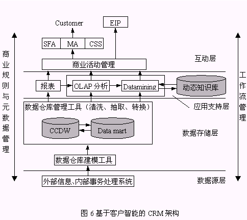圖6是本文給出的以客戶智能為核心的I-CRM系統(tǒng)架構(gòu)。從數(shù)據(jù)源層來的客戶數(shù)據(jù)經(jīng)過ETL(抽取、轉(zhuǎn)換、裝載)、清洗后以數(shù)據(jù)存儲層的CCDW或數(shù)據(jù)集市的形式存儲。應(yīng)用支持層是提供了報表查詢、OLAP、知識發(fā)現(xiàn)分析決策工具,作用于客戶數(shù)據(jù),該過程產(chǎn)生的有價值的客戶知識存儲于動態(tài)知識庫中;訉犹峁┝薎-CRM利用客戶知識從而有效實施其功能的場所。該架構(gòu)具有以下特點(diǎn):