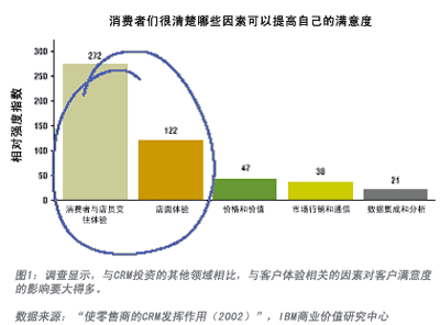 IBM商業(yè)價(jià)值研究中心的一項(xiàng)研究結(jié)果印證了筆者的設(shè)想。IBM 對(duì)美國(guó)10家零售商的消費(fèi)群進(jìn)行了調(diào)查,其中包括5家表現(xiàn)較好的(過(guò)去3年中在店面單位面積銷(xiāo)售和凈收入的增長(zhǎng)方面做得很好)和5家表現(xiàn)較差的(業(yè)績(jī)持平或出現(xiàn)下滑)。調(diào)查發(fā)現(xiàn),領(lǐng)先的零售商能夠同時(shí)有效使用關(guān)鍵的滿(mǎn)意度推動(dòng)因素和關(guān)系要素,為消費(fèi)者提供最佳的“總體體驗(yàn)”,即一家公司(或一個(gè)品牌)有形、無(wú)形地給客戶(hù)留下的總體印象。該項(xiàng)調(diào)查的統(tǒng)計(jì)分析結(jié)果發(fā)現(xiàn)了5組滿(mǎn)意度推動(dòng)因素: