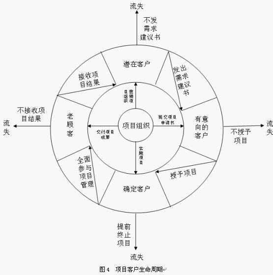 需要特別注意的一點(diǎn)是,在項(xiàng)目的整個生命周期中,如果客戶不滿意項(xiàng)目組織提供的服務(wù),將會離開項(xiàng)目組織,造成客戶流失。