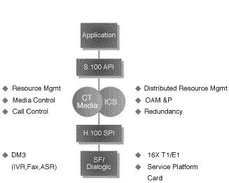 Sigma計(jì)劃的硬件平臺(tái)支持H.110的cPCI(CompactPCI)總線。媒體處理通過配置Dialogic高密度的DM3TM硬件來操作,它提供諸如自動(dòng)語(yǔ)音識(shí)別、傳真、互聯(lián)網(wǎng)語(yǔ)音和編碼、以及交互式語(yǔ)音應(yīng)答功能。Summa Four通過集成它的接口控制卡(ICC)來提供高密度的網(wǎng)絡(luò)接口,最大可支持16個(gè)T1/E1。另外,服務(wù)資源設(shè)備,如信令、號(hào)音生成、會(huì)議、編解碼、以及互聯(lián)網(wǎng)語(yǔ)音轉(zhuǎn)換等,將通過Summa Four的服務(wù)平臺(tái)卡(SPC)支持,它最多可有32個(gè)DSP。ICC和SPC均可由Summa Four的VCO產(chǎn)品家族支撐。通過H.110總線,任何與標(biāo)準(zhǔn)兼容的制造商制造的硬件組件都能輕易的加入到平臺(tái)中。