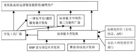 。。CTI板卡是插在計(jì)算機(jī)總線上,用于電話接口及有關(guān)處理的計(jì)算機(jī)板卡,又稱“語(yǔ)音卡”。語(yǔ)音卡是CTI系統(tǒng)中關(guān)鍵的硬件設(shè)備,它使得計(jì)算機(jī)和電話快速、緊密地結(jié)合在一起。CTI板卡不僅是一種產(chǎn)品,它已經(jīng)發(fā)展成為了一個(gè)產(chǎn)業(yè)。CTI板卡的產(chǎn)業(yè)鏈條所涉及的廠商和組織,如圖所示。