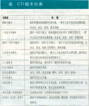 。。一般情況下,語(yǔ)音卡都是按功能來命名和劃分種類的。右表列出了按功能劃分的各種類型的CTI板卡。