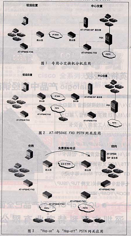 在圖2所示的應(yīng)用中,遠(yuǎn)程局位置直接附加了一個(gè)AT-VP504E FXO裝置,為PSTN提供IP電話網(wǎng)關(guān)服務(wù),IP語音呼叫被轉(zhuǎn)化為模擬格式通過標(biāo)準(zhǔn)電話線路進(jìn)行傳輸。同樣,來自普通電話網(wǎng)絡(luò)的呼入呼叫,也被轉(zhuǎn)化為IP呼叫通過企業(yè)IP網(wǎng)絡(luò)轉(zhuǎn)接。這就使本地PSTN呼叫者,可向企業(yè)或其他目的地打免費(fèi)長(zhǎng)途電話。