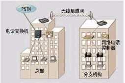 如圖2所示,兩個(gè)辦公樓之間距離較遠(yuǎn),不方便布線,其計(jì)算機(jī)網(wǎng)絡(luò)可以通過無(wú)線局域網(wǎng)來(lái)連接。在總部已有電話交換機(jī)系統(tǒng),這時(shí)只需在分支機(jī)構(gòu)中增加Cisco網(wǎng)絡(luò)電話控制器,布署IP電話機(jī),然后通過總部帶語(yǔ)音模塊的Cisco路由器或交換機(jī),接入總部的電話交換機(jī),分支機(jī)構(gòu)就可以享用總部的電話中繼線路,與總部一樣自由地使用電話系統(tǒng)。