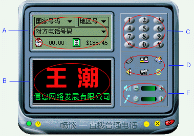 。ㄈ鐖D1)“王潮暢談?wù)Z音全球通”的主界面。A部分是虛擬液晶顯示屏,這里顯示的內(nèi)容與 D(功能鍵區(qū))相對(duì)應(yīng),B是廣告位,如果有興趣可以與王潮公司聯(lián)系作廣告(^_^),C是撥號(hào)區(qū),D是功能按鈕區(qū),集中了這個(gè)軟件的主要功能,E是音量調(diào)節(jié)區(qū)。整個(gè)界面簡潔合理。