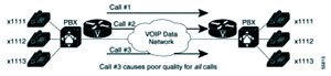 網(wǎng)絡(luò)中,話音網(wǎng)關(guān)路由器并不了解網(wǎng)絡(luò)中的狀況,包括:網(wǎng)絡(luò)的鏈路資源是否已經(jīng)飽和及網(wǎng)絡(luò)延遲,丟包率和網(wǎng)絡(luò)抖動等參數(shù)是否可以滿足話音應(yīng)用的需求。如果在不能夠保證網(wǎng)絡(luò)可以提供足夠的資源保證話音質(zhì)量的情況下,建立新的通話鏈路可能影響已經(jīng)建立的鏈路,或者是降低所有的通話話音質(zhì)量。如圖三,如果廣域網(wǎng)的帶寬只能容納兩個語音的呼叫,第三個呼叫的建立會導(dǎo)致所有的呼叫質(zhì)量下降。在這種情況下,拒絕呼叫的建立好過建立一條沒有質(zhì)量保證的鏈路。