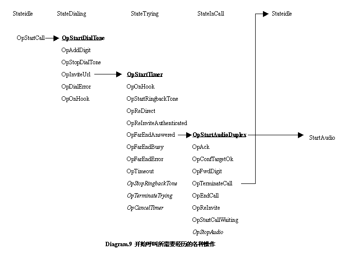 狀態(tài)中;這時用戶輸入被叫的電話號碼,或者是Url,在Dialing狀態(tài)中所有的事件被OpAddDigit操作處理,但是這個操作并不會讓當(dāng)前的狀態(tài)從Dialing離開,而是維持到撥號完畢。