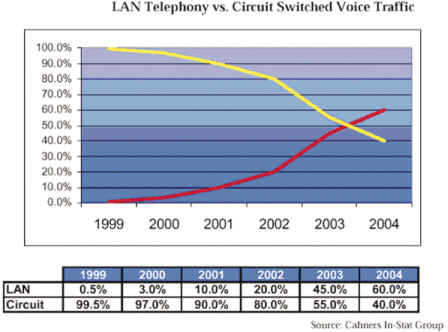 Group的資料顯示,LAN Telephone與Circuit Switched Voice Traffic比較圖,呈現(xiàn)數(shù)據(jù)網(wǎng)絡(luò)的占有率將在二至三年后,首度超越語(yǔ)音網(wǎng)絡(luò)的流量占有率。因此,不論是盤(pán)據(jù)傳統(tǒng)電信市場(chǎng)大廠如Lucent及Nortel,或是代表網(wǎng)絡(luò)新興勢(shì)力的Cisco,也都在積極爭(zhēng)搶這塊新領(lǐng)域的主導(dǎo)權(quán)。于是,有人說(shuō),「IP