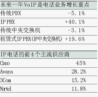 事實(shí)上,北美市場的實(shí)際銷售量已經(jīng)表明,市場中的傳統(tǒng)語音交換機(jī)銷售量已經(jīng)在明顯下降,而具備IP功能或純IP系統(tǒng)的銷售量卻在穩(wěn)步上升。Gartner 預(yù)計(jì),2005年在北美地區(qū)銷售的純IP系統(tǒng)總價(jià)值將高達(dá)9.03億美元,比2004年的6.86億美元上升32%。同時(shí),傳統(tǒng)電路交換系統(tǒng)的銷售量將從2004年的14億美元下降至9.99億美元,下降的幅度是32%。而混合式系統(tǒng)的銷量增長幅度可望達(dá)到30%,也就是說,從2004年的1.5億美元增長到2005年的2億美元。