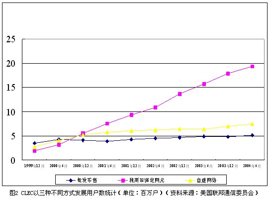 從經(jīng)營(yíng)模式上看,本地非主導(dǎo)運(yùn)營(yíng)商的商業(yè)模式在過去的5年中發(fā)生了很大變化。在市場(chǎng)剛剛開始引入競(jìng)爭(zhēng)的1999年,42.9%的本地非主導(dǎo)運(yùn)營(yíng)商選擇了批發(fā)零售這種進(jìn)入門檻相對(duì)較低的商業(yè)模式,本地電話市場(chǎng)一度活躍著大量地區(qū)性的小運(yùn)營(yíng)商。由于面臨本地主導(dǎo)運(yùn)營(yíng)商的強(qiáng)烈抵制,非綁定網(wǎng)元政策的實(shí)施自公布以來一再推遲,經(jīng)過反復(fù)的法律訴訟,美國(guó)最高法院在2002年最終裁定非綁定網(wǎng)元政策合法。自那時(shí)起,AT&T、MCI等全國(guó)性的長(zhǎng)途電話運(yùn)營(yíng)商紛紛通過租用非綁定網(wǎng)元的方式進(jìn)入本地電話市場(chǎng)。截止到2004年6月,本地主導(dǎo)運(yùn)營(yíng)商已經(jīng)提供了約2150萬線非綁定本地用戶線給本地非主導(dǎo)運(yùn)營(yíng)商。CLEC以三種方式發(fā)展用戶的情況如圖2所示。