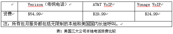 隨著寬帶接入的進(jìn)一步普及,VoIP似乎為打破本地環(huán)路的瓶頸提供了新的選擇,AT&T、Qwest、時(shí)代華納、Verizon等老牌運(yùn)營(yíng)商紛紛開始提供這項(xiàng)服務(wù)。AT&T于2004年3月在新澤西州和德克薩斯州推出了29.99美元的包月計(jì)劃,其VoIP業(yè)務(wù)不僅包含了基本語音服務(wù),也提供諸如呼叫轉(zhuǎn)移、會(huì)議電話、來電顯示等增值服務(wù),美國(guó)三大公司本地電話資費(fèi)如表1所示。