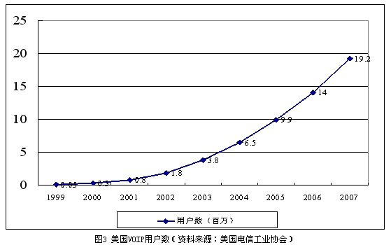 與此同時(shí),Qwest也開始在明尼蘇達(dá)州提供類似的VoIP業(yè)務(wù),并計(jì)劃在近期內(nèi)推向全國(guó)。Verizon與北電網(wǎng)絡(luò)簽訂了大筆的訂單,計(jì)劃全面改造其本地電話網(wǎng)絡(luò)提供的VoIP業(yè)務(wù)。一些曾經(jīng)著名的網(wǎng)絡(luò)電話公司(如Net2Phone)也開始進(jìn)入傳統(tǒng)電話市場(chǎng)。截止到2004年2月底,Vonage的全I(xiàn)P網(wǎng)絡(luò)已經(jīng)擁有13萬VoIP用戶。據(jù)美國(guó)電信工業(yè)協(xié)會(huì)預(yù)測(cè),到2007年年末,全美的VoIP用戶將會(huì)達(dá)到1920萬戶,如圖3所示。